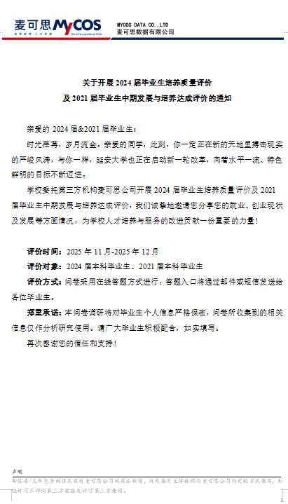 关于开展2024届毕业生培养质量评价 及2021届毕业生中期发展与培养达成评价的通知